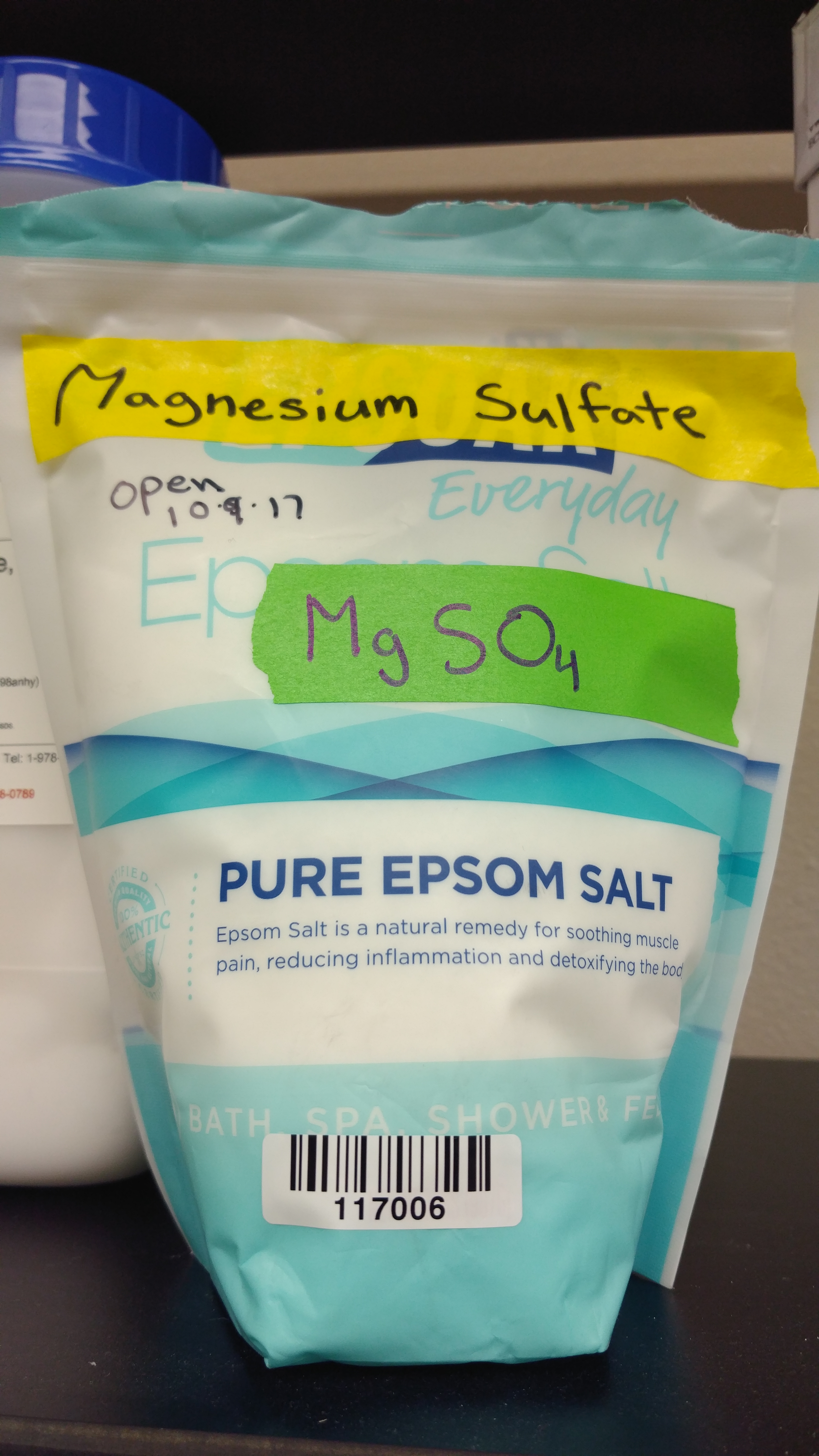 Magnesium Sulfate is used to make 1M MgSO4, a component of NGM plates. We keep a pre-made 1M stock on Shelf R.